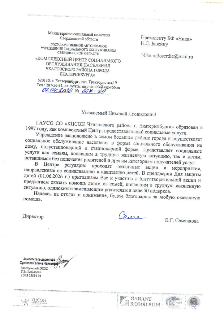 В Благотворительный фонд «НИКА» поступило письмо от Комплексного центра социального обслуживания населения Чкаловского района г. Екатеринбурга (обращение прилагается). Центр просит помочь с подарками для 50 детей из семей, попавших в трудную жизненную ситуацию, одиноких и замещающих родителей. БФ «НИКА» на протяжении многих лет сотрудничает с этим учреждением, помогая его подопечным, и в этот раз мы тоже не останемся в стороне.