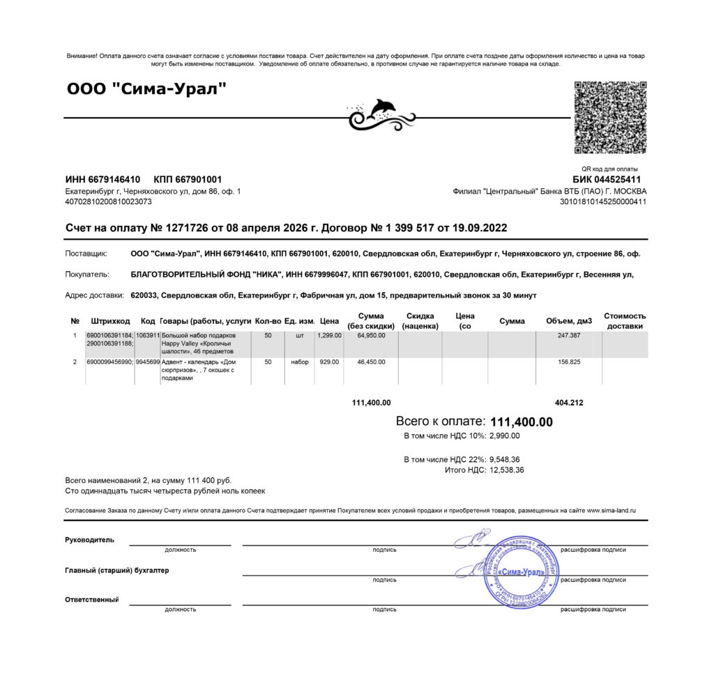 Вы можете частично или полностью перевести средства на наш расчетный счет: № 40703810700030000178, Корреспондентский счет 30101810500000000904, ОГРН 1116600003849, ИНН / КПП – 6679996047, 667901001, либо частично или полностью оплатить счет Поставщика (счет прилагается), в назначении платежа указать: «Частичная оплата по счету за БФ «НИКА» ИНН 6679996047».